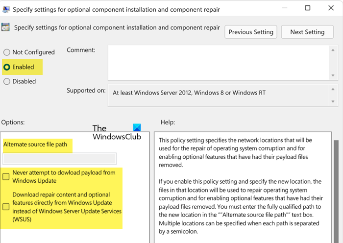 - ÜberprüfenVersuchen Sie niemals, Payload von Windows Update herunterzuladenUndLaden Sie optionale Funktionen zum Reparieren von Inhalten direkt von Windows Update statt von Windows Server Update Services (WSUS) herunter.