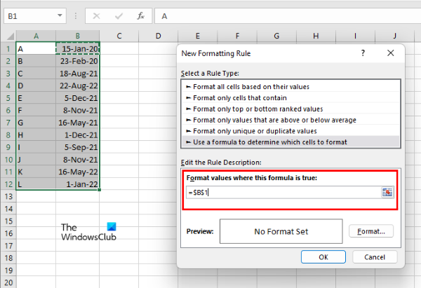 Wie Sie im obigen Screenshot sehen können, lautet die Formel, die nach Auswahl des Datums in der ersten Zeile im Feld angezeigt wurde=$B$1. Diese Formel gibt die Position des Datums in der Tabelle an, also die erste Zeile von Spalte B. Das $-Zeichen in der Formel gibt an, dass Zeile 1 und Spalte B gesperrt sind. Da wir die Daten in verschiedenen Zeilen, aber in derselben Spalte hervorheben, müssen wir nur die Spalte und nicht die Zeile sperren. Löschen Sie daher das $-Zeichen vor 1 in der Formel. Die Formel lautet dann=$B1.