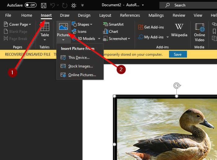 Sie möchten nun fortfahren und Ihrem Dokument ein Bild hinzufügen. Sie können dies tun, indem Sie auf klickenEinfügenRegisterkarte befindet sich auf derSchleife, und wählen Sie dort ausBilderum ein Foto von Ihrer Festplatte hinzuzufügen, oder „Online“, um eines aus dem Internet herunterzuladen und einzufügen.