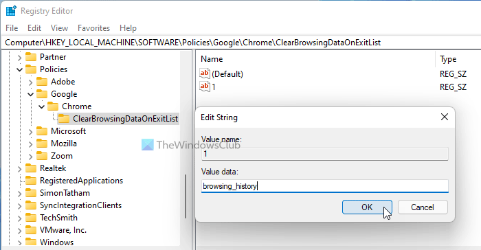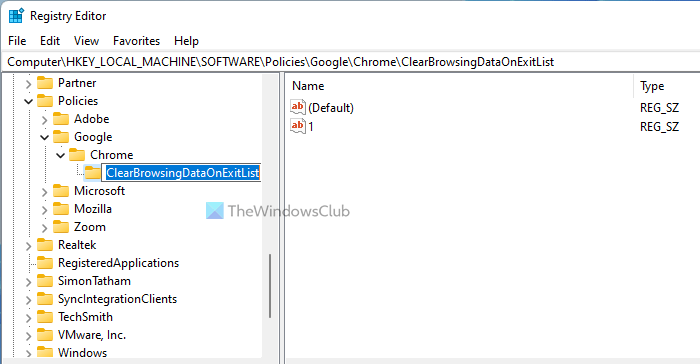 Klicken Sie anschließend mit der rechten Maustaste auf ClearBrowsingDataOnExitList >Neu > Zeichenfolgewert, und benennen Sie es1.