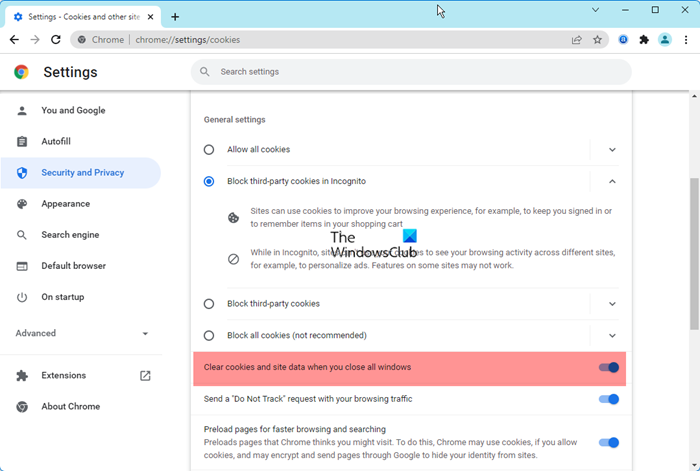 - Aktivieren Sie „Cookies und Websitedaten löschen, wenn Sie alle Fenster schließen“.