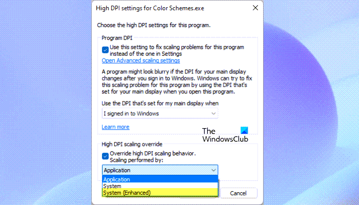 Unter demÜberschreibung der hohen DPI-SkalierungAktivieren Sie im Abschnitt „Überschreiben Sie das Verhalten bei hoher DPI-SkalierungKontrollkästchen. Im Dropdown-Menü sehen Sie diese drei Optionen:Anwendung,System, UndSystem (erweitert).