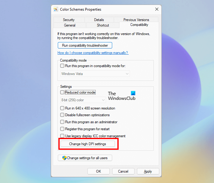 Wählen Sie nach dem Öffnen des Eigenschaftenfensters das ausKompatibilitätRegisterkarte und klicken Sie aufÄndern Sie die hohen DPI-EinstellungenTaste. Wenn Sie diese Einstellungen für alle Benutzer Ihres Systems anwenden möchten, klicken Sie aufÄndern Sie die Einstellungen für alle Benutzer.