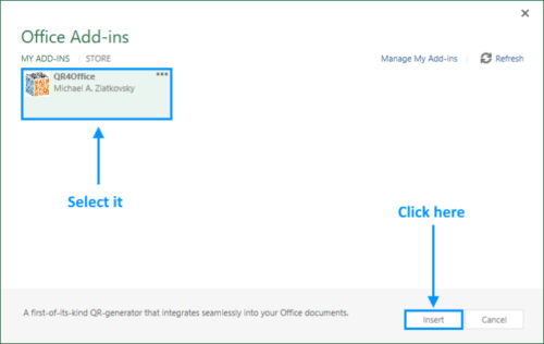 1] Starten Sie Excel und gehen Sie zu „Einfügen > Meine Add-Ins.“ Wählen Sie QR4Office und klicken Sie auf „Einfügen.“