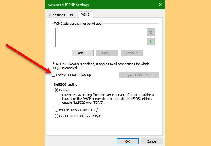 - Gehe zumGEWINNTTab, deaktivierenAktivieren Sie die LMHOSTS-Suche, und klicken Sie auf OK.