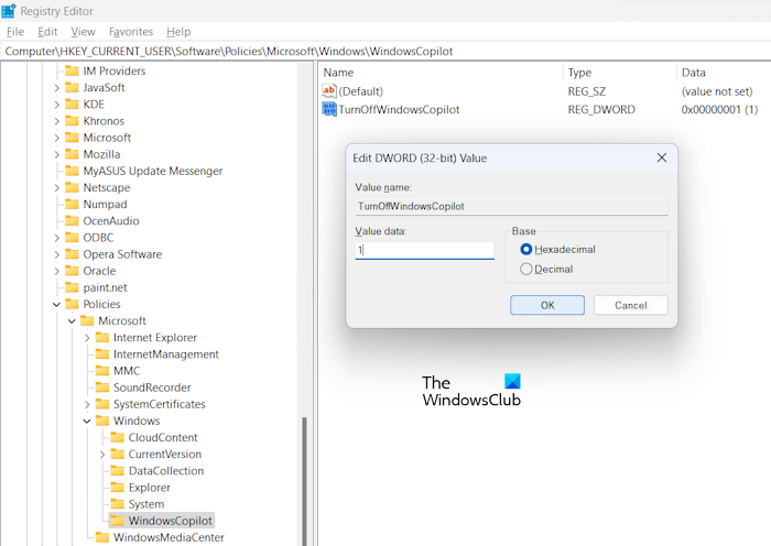 Klicken Sie mit der rechten Maustaste aufWindowsCopilot ausschaltenGeben Sie den Wert ein und wählen Sie „Ändern“. Eingeben1in seinemWertdaten. KlickenOKum die Änderungen zu speichern.