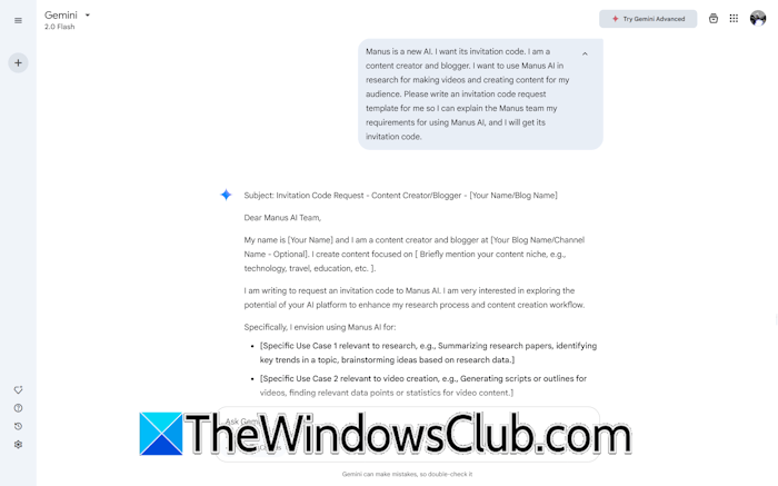 Kopieren Sie nicht den vorherigen Grund für die Verwendung von Manus AI und fügen Sie ihn nicht ein, während Sie das Anfrageformular mit einer anderen E-Mail-ID ausfüllen. Ändern Sie Ihre Eingabeaufforderung und generieren Sie eine neue Antwort.