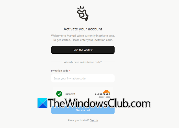 Um den Manus AI-Einladungscode zu erhalten, besuchen Sie dieoffizielle Websiteund klicken Sie aufLegen Sie losTaste. Sie werden zum nächsten Bildschirm weitergeleitet, wo Sie aufgefordert werden, den Einladungscode einzugeben oder sich auf die Warteliste einzutragen. KlickenTreten Sie der Warteliste bei.