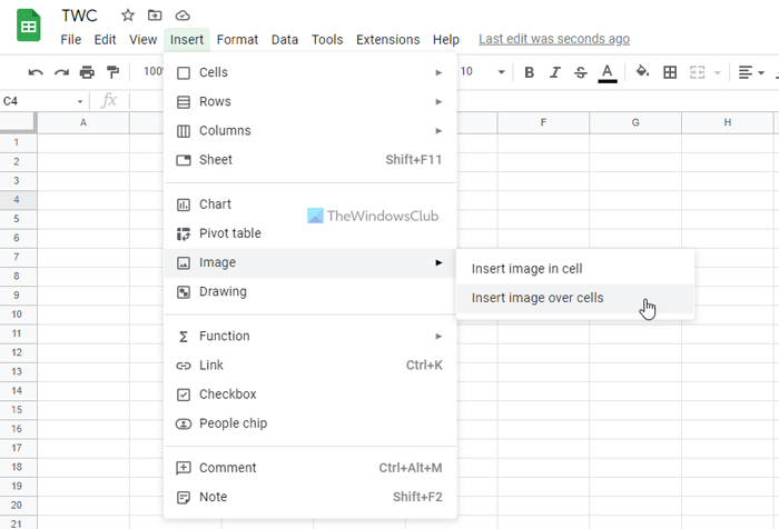 Sie können in Google Sheets nicht mehr als ein Bild in eine Zelle einfügen. Wenn Sie jedoch die zweite Option auswählen,Bild über Zellen einfügenkönnen Sie Ihrer Tabelle mehrere Bilder hinzufügen. Wenn Sie hingegen jedes Mal eine andere Zelle auswählen, ist es möglich, mehrere Bilder in Google Sheets einzufügen.