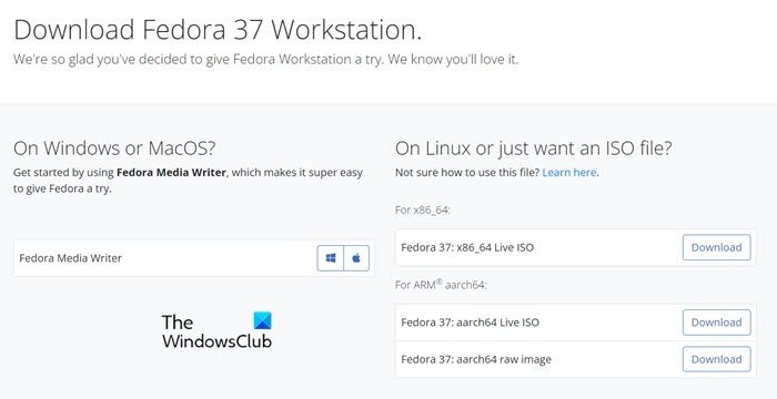 Was benötigen Sie, um Software zu installieren? Die Software selbst. Um Fedora zu installieren, benötigen Sie also die ISO von Fedora. Um dasselbe zu tun, navigieren Sie zugetfedora.orgund klicken Sie aufJetzt herunterladenKlicken Sie auf die Schaltfläche „Fedora Workstation“. Wählen Sie das Betriebssystem aus, für das Sie die Datei herunterladen möchten, und laden Sie sie dann herunter. Stellen Sie sicher, dass die ISO-Datei an einem zugänglichen Ort aufbewahrt wird.