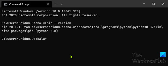 pip 20.1.1 from c:\users\<username>\appdata\local\programs\python\python38-32\lib\site-packages\pip (python 3.8)
