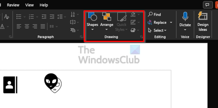 Es gibt einen Abschnitt in der Multifunktionsleiste, der aufgerufen wirdZeichnung. Sie können es finden, indem Sie auf klickenHeimKlicken Sie auf die Registerkarte und schauen Sie von dort aus nach rechtsSchleifeund Sie sehen den Abschnitt „Zeichnung“.