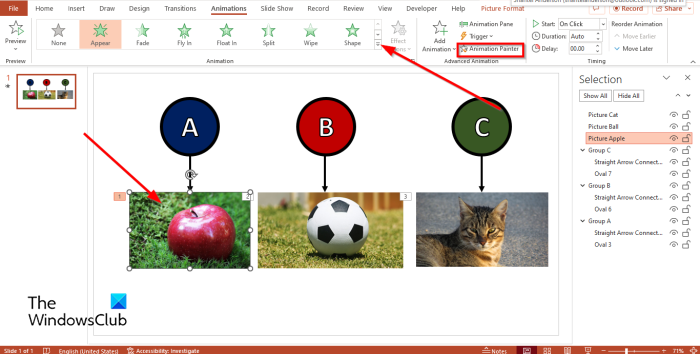 - Wählen Sie das animierte Bild aus, klicken Sie auf die Schaltfläche „Animation Painter“ und dann auf die anderen Bilder auf der Folie.