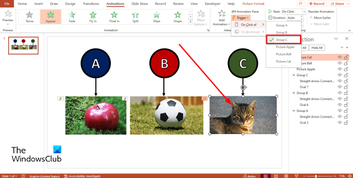 - Klicken Sie auf die Schaltfläche „Auslösen“, bewegen Sie den Cursor über „Beim Klicken auf“ und wählen Sie dann aus der Liste aus, welches Objekt Sie zum Auslösen der Animation verwenden möchten.