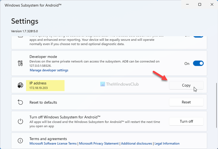 Immer wenn Sie die Windows-Subsystem-App für Android auf Ihrem Computer öffnen, wird eine IP-Adresse für die weitere Verbindung angezeigt. Sie müssen diese IP-Adresse in Ihre Zwischenablage kopieren. Gehen Sie dazu wie folgt vor: