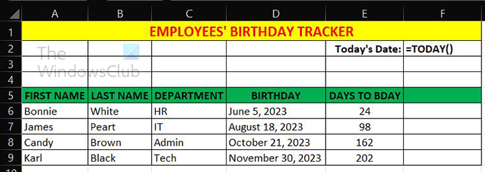 Sie können das heutige Datum an jedem neuen Tag ändern. Gehen Sie dazu zu Zelle F2 (geben Sie Ihren Zellbezug ein) und schreiben Sie die folgende Formel.