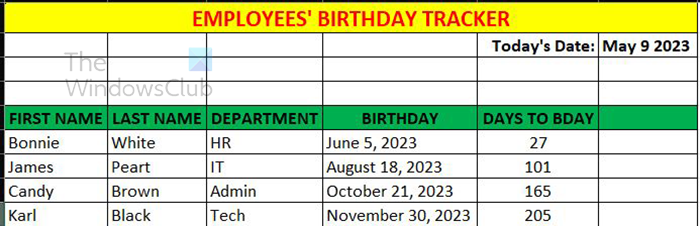 Dies ist das fertige Excel-Dokument. Beachten Sie, dass die Formel nicht von dem Datum abhing, das oben im Feld „Heutiges Datum“ eingegeben wurde. Dieses Datum dient lediglich als visuelle Referenz für den Benutzer.