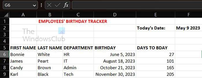 D6 ist die Zelle, in die Sie das Datum geschrieben haben. Das Minuszeichen (-) vor dem heutigen Tag weist Excel an, das zukünftige Datum (D6) vom heutigen Datum zu subtrahieren.