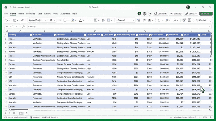 - Sie können eine Frage zu Ihrem Datensatz stellen oder eine Zelle eingeben, und Copilot empfiehlt Formeln und Funktionen basierend auf den aktuellen Daten auf Ihrem Arbeitsblatt.