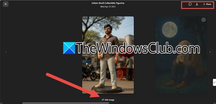 Sie können das Bild auch herunterladen, teilen oder mit dem Gespräch zur Erstellung dieses Bildes fortfahren. Wenn Sie ein Bild löschen möchten, klicken Sie darauf und dann auf das Konversationssymbol, um den Konversationsthread zu finden. Klicken Sie auf die drei Punkte und dann auf Löschen.