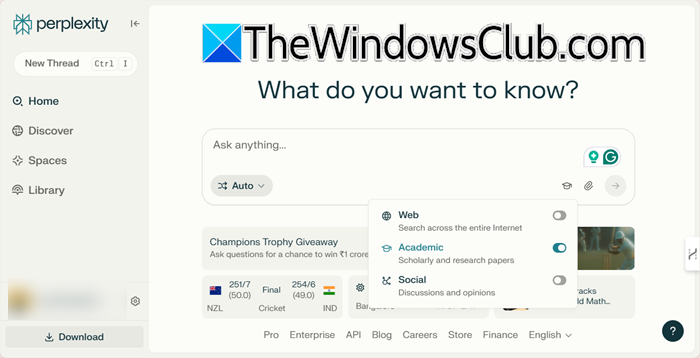 Perplexity durchsucht wie jeder andere Chatbot mehrere Quellen. Zu Forschungszwecken sollten wir es auf Acedemic setzen. Bewegen Sie dazu den Mauszeiger auf dem Startbildschirm von Perplexity über das Hutsymbol, das mit „beschriftet“ wirdQuellen für die Suche festlegen,Klicken Sie darauf und aktivieren Sie esAkademisch.