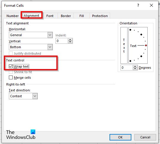 - Auf derAusrichtungRegisterkarte, In derTextkontrolleKontrollkästchen, klicken Sie auf das Kontrollkästchen fürWickeln, und klicken Sie dannOK.