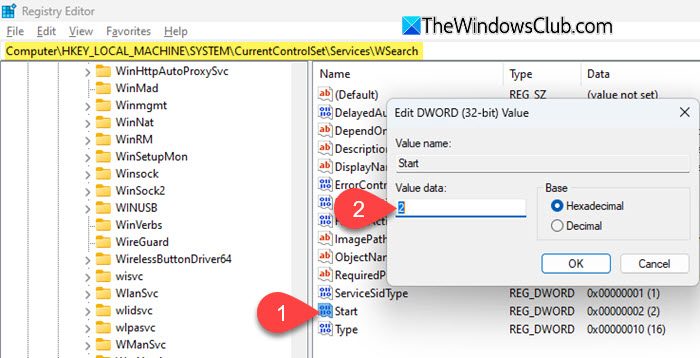 DoppelklickenStartim rechten Bereich und stellen Sie es einWertZu2. Dasstellt sicher, dass die Windows-Suche automatisch startet. KlickenOKund schließen Sie den Registrierungseditor. Starten Sie Ihren PC neu und prüfen Sie, ob die Indizierung beginnt.