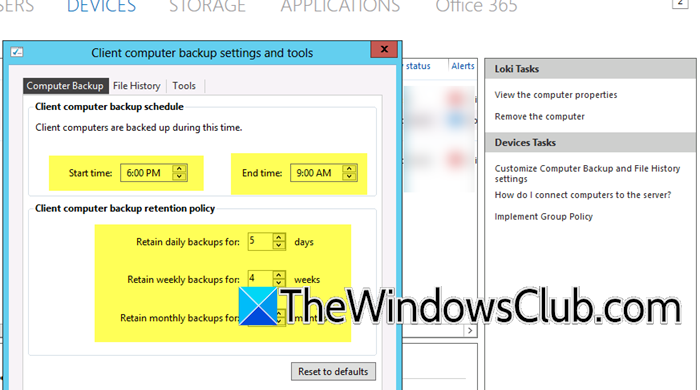 Sobald die Sicherungen des Client-Computers konfiguriert sind, kann das anfängliche Sicherungsfenster oder die Aufbewahrungsrichtlinie geändert werden. Wenn Benutzer jemals zu den ursprünglichen Einstellungen zurückkehren möchten, können sie dies über die Schaltfläche „Auf Standardeinstellungen zurücksetzen“ tun. Um dasselbe zu tun, befolgen Sie die unten aufgeführten Schritte.