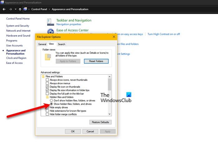 - Gehe zumSichtTab und wählen Sie ausSwie versteckte Dateien, Ordner oder TreiberausVersteckte Dateien und Ordner.
