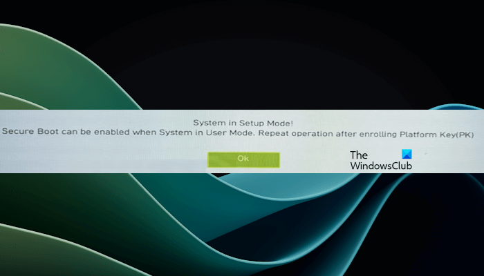 Secure Boot ist ein Sicherheitsstandard, der von Mitgliedern der PC-Industrie entwickelt wurde. Dadurch wird sichergestellt, dass das Gerät nur mit der Software startet, der der Originalgerätehersteller (OEM) vertraut. Secure Boot ist eines der wesentlichen Elemente. Wenn Sie den Fehler sehenSystem im Setup-Modus: Secure Boot kann aktiviert werden, wenn sich das System im Benutzermodus befindetBeim Aktivieren des sicheren Starts helfen Ihnen die in diesem Artikel bereitgestellten Lösungen.