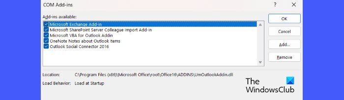 Notiz:Klicken Sie nicht auf die Schaltfläche „Entfernen“. Wenn Sie dies tun, kann es passieren, dass Sie die COM-Add-Ins versehentlich löschen, wenn Sie über Administratorrechte verfügen. Diese Add-Ins erweitern die Funktionen von Outlook durch das Hinzufügen spezieller Funktionen. - Beenden Sie Outlook.