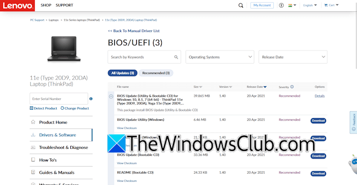 Da Sie Ihren Laptop nicht verwenden können, müssen Sie einen anderen funktionierenden Computer verwenden, um das neueste BIOS herunterzuladen. Besuchen Sie die offizielle Website von Lenovo und geben Sie die Modellnummer Ihres Laptops ein, um die richtige BIOS-Firmware herunterzuladen.