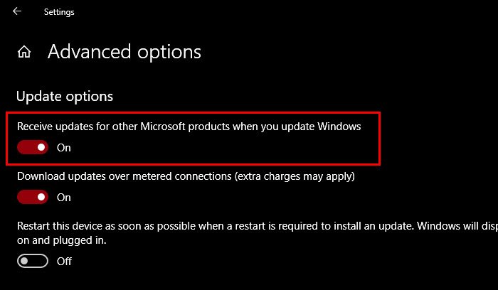- Verwenden Sie den Schalter, um „Erhalten Sie Updates für andere Microsoft-Produkte, wenn Sie Windows aktualisieren„.