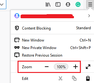 Es ist zu beachten, dass der Zoom des Firefox-Browsers über das Menü in der oberen rechten Ecke des Browserfensters (gekennzeichnet durch drei vertikale Linien) geändert wird.