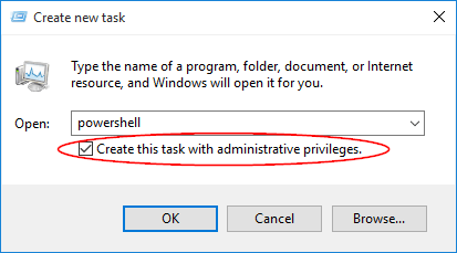 Τύποςpowershellκαι επιλέξτε το "Δημιουργήστε αυτήν την εργασία με δικαιώματα διαχειριστή"το πλαίσιο ελέγχου και κάντε κλικ στο OK για να ανοίξετε ένα ανυψωμένο μήνυμα PowerShell.