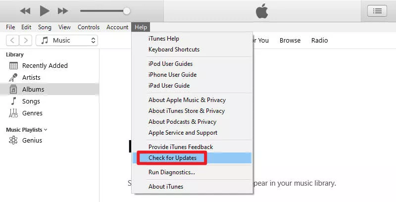 1. Ανοίξτε το iTunes, κάντε κλικ στη Βοήθεια > Έλεγχος για ενημερώσεις και, στη συνέχεια, ακολουθήστε τις οδηγίες που εμφανίζονται στην οθόνη για να εγκαταστήσετε τυχόν διαθέσιμες ενημερώσεις.