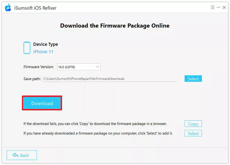 4. Μόλις το λογισμικό αναγνωρίσει το iPhone σας, κάντε κλικ στο Λήψη για λήψη του πιο πρόσφατου πακέτου υλικολογισμικού που απαιτείται για τη διόρθωση του iOS.
