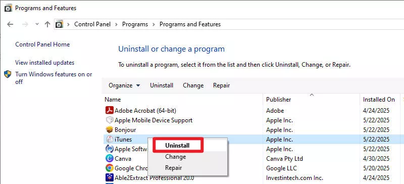 1. Μεταβείτε στον Πίνακα Ελέγχου > Απεγκατάσταση προγράμματος για να απεγκαταστήσετε το iTunes και το σχετικό λογισμικό Apple (όπως η Υποστήριξη φορητών συσκευών Apple και το Bonjour).