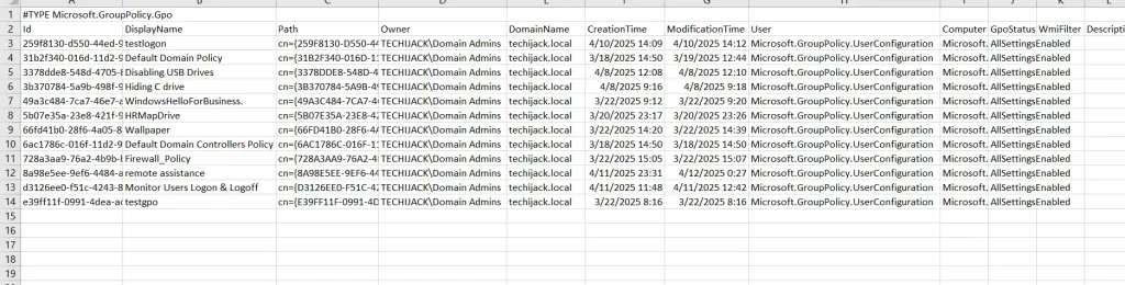 Get-GPO -All | Export-Csv -Path c:reportsgpo.csvΣημείωση: Βεβαιωθείτε ότι έχετε τοεκθέσειςφάκελο ήδη στοΝΤΟ: