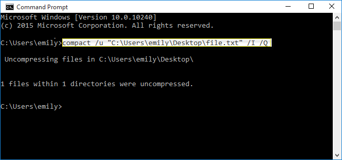 compact /u “C:UsersemilyDesktopfile.txt” /I /Q