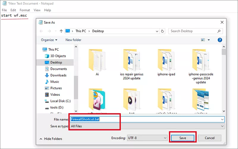 Βήμα 3:Ορίστε τον τύπο αρχείου σεΌλα τα Αρχείακαι ονομάστε τοFirewallShortcut.bat.