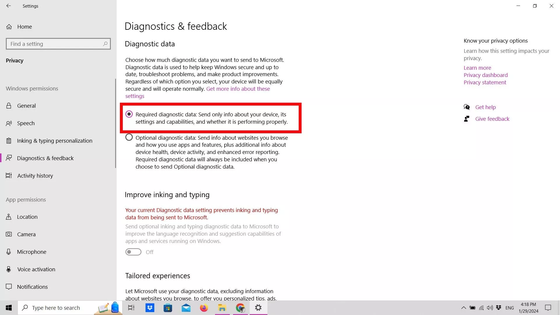 - Γυρίστε όλες τις ρυθμίσειςΜακριά από. Ενώ πρέπει να στείλετε ορισμένα διαγνωστικά δεδομένα στη Microsoft (οι επιλογές είναι μόνο Απαιτούμενες και Προαιρετικές, όχι Καμία), μπορείτε να το περιορίσετε στο ελάχιστο.