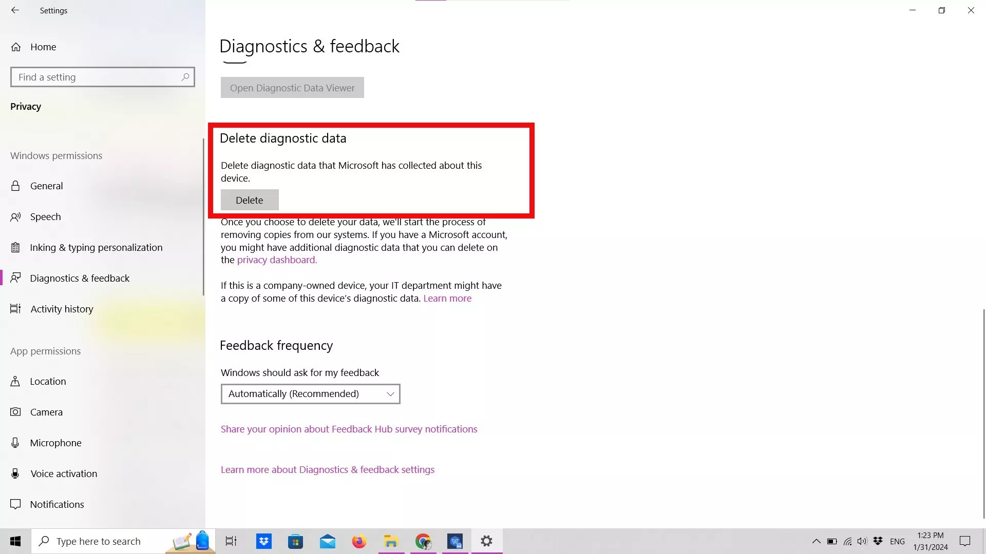 - Μπορείτε επίσης να διαγράψετε τα διαγνωστικά δεδομένα που έχει ήδη συλλέξει η Microsoft για τη συσκευή σας κάνοντας κύλιση προς τα κάτω και κάνοντας κλικΔιαγράφωστην επιλογή «Διαγραφή διαγνωστικών δεδομένων».