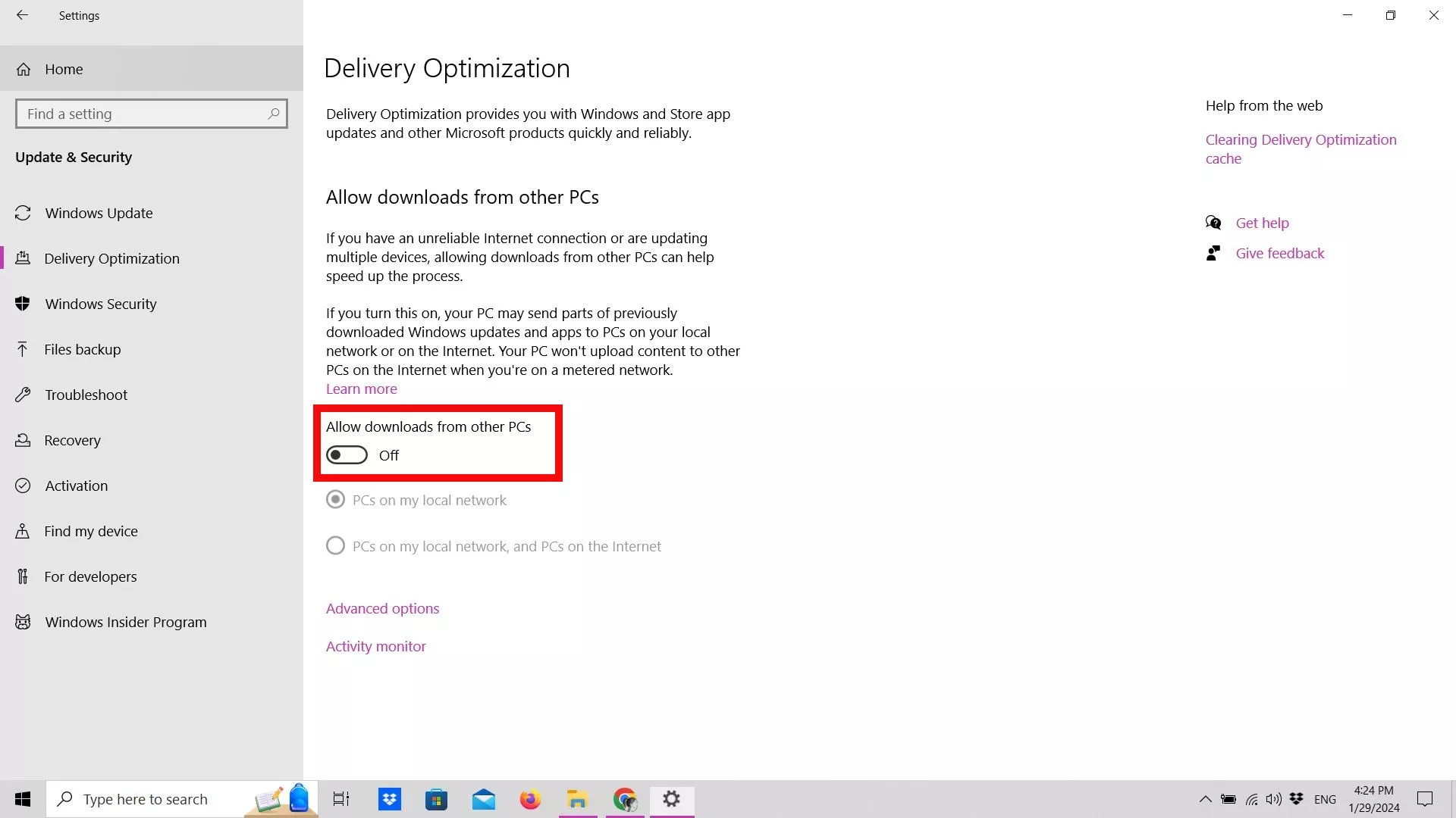 Για να απενεργοποιήσετε την κοινή χρήση ενημερώσεων στα Windows 10: