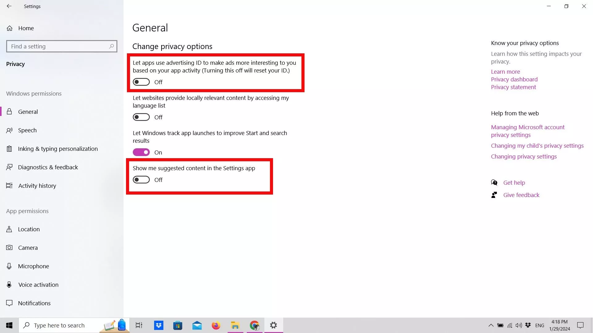 - Μπορείτε επίσης να απενεργοποιήσετε την επιλογή "Εμφάνιση προτεινόμενου περιεχομένου στην εφαρμογή Ρυθμίσεις". Και voila, δεν υπάρχει πλέον παρακολούθηση διαφημίσεων!