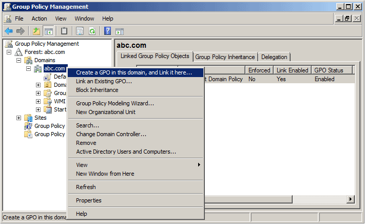 - Για να δημιουργήσετε μια νέα πολιτική τομέα, κάντε κλικ στο όνομα τομέα σας στον αριστερό πίνακα και, στη συνέχεια, επιλέξτεΔημιουργήστε ένα GPO σε αυτόν τον τομέα και συνδέστε το εδώ….