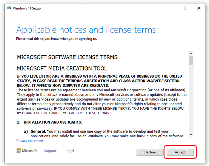 Βήμα 2:Εκτελέστε το εργαλείο MediaCreationToolW11 και, στη συνέχεια, αποδεχτείτε τις ισχύουσες ειδοποιήσεις και τους όρους άδειας χρήσης.