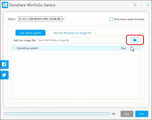 Βήμα 3:Ανοίξτε το iSunshare WinToGo Genius και, στη συνέχεια, επιλέξτε τη μονάδα USB για να προχωρήσετε. Στη συνέχεια, μπορείτε να κάνετε κλικ στην επιλογή Χρήση του αρχείου εικόνας iso των Windows.