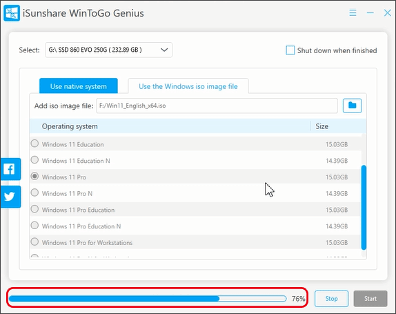 Εάν πρόκειται να δημιουργήσετε τη μονάδα εκκίνησης των Windows 11, η οποία μπορεί να εκτελεστεί χωρίς εγκατάσταση σε υπολογιστή, το iSunshare WinToGo Genius μπορεί να σας βοηθήσει να το κάνετε αυτό σε λίγα λεπτά. Είναι εξαιρετικά εύκολο να εγγράψετε το αρχείο εικόνας ISO των Windows 11 στη μονάδα USB για να κάνετε τα φορητά Windows σε USB, ώστε να μπορείτε να τα μεταφέρετε οπουδήποτε. Το iSunshare WinToGo Genius μπορεί να λειτουργήσει σε όλες τις εκδόσεις των Windows 11/10/8/8.1/7. Επιπλέον, υποστηρίζει τη μονάδα flash USB σε μεγάλο μέγεθος και τον σκληρό δίσκο USB. Εάν έχετε λιγότερο χρόνο στην αναμονή, μπορείτε να ρυθμίσετε τον υπολογιστή να τερματίζεται μετά την κατασκευή του USB με δυνατότητα εκκίνησης.