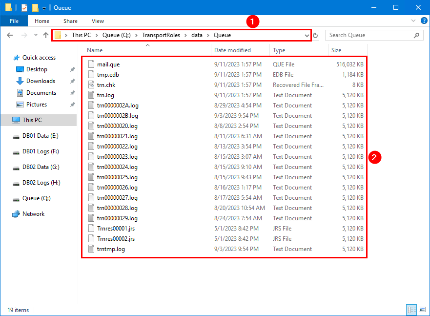 C:Program FilesMicrosoftExchange ServerV15TransportRolesdataQueueΈτσι φαίνεται μετά τη μεταφορά της βάσης δεδομένων της ουράς αλληλογραφίας σε άλλο δίσκο.